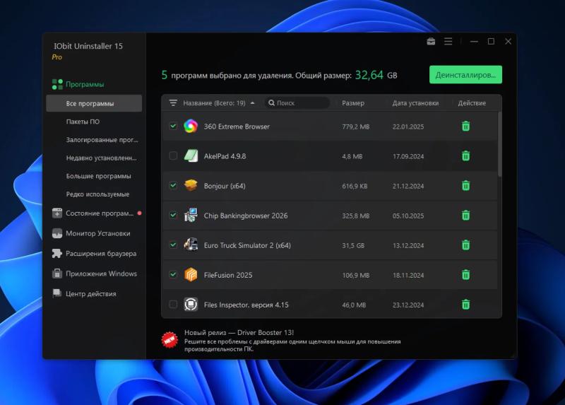 IObit Uninstaller — утилита для полного удаления программ, UWP-приложений, панелей инструментов и расширений браузеров с глубоким сканированием «хвостов» (остатков файлов и записей реестра). Pro-версия добавляет автоматизацию, мониторинг установок и расширенные алгоритмы очистки.